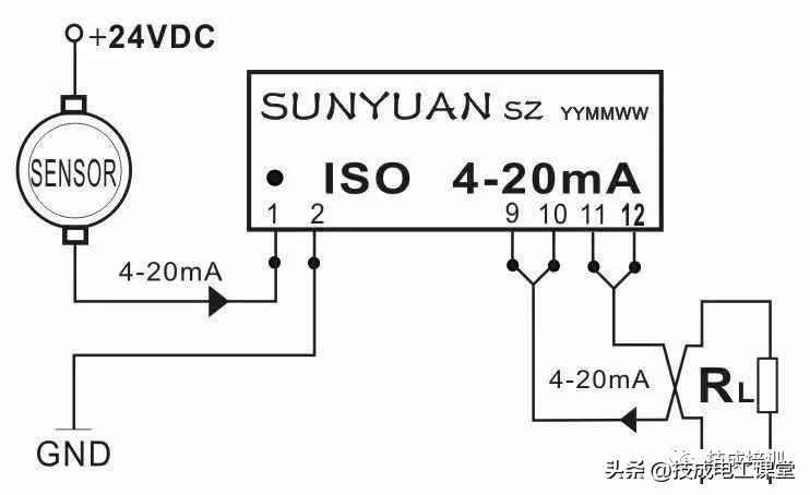 1.4两线制传感器输出4-20mA电流经隔离调理匹配(解决输入输出间冲突)后与PLC连接。如图7所示,温度、转速传感器正端接12—24VDC,负端输出4-20mA电流。