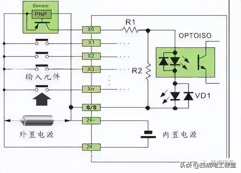 SRCE输入方式,可接PNP型传感器。即X端口与整机极相连。(外部输入组件可以为按钮开关、行程开关、舌簧开关、霍尔开关、接近开关、光电开关、光幕传感器、继电器触点、接触器触电等开关量的元件。)