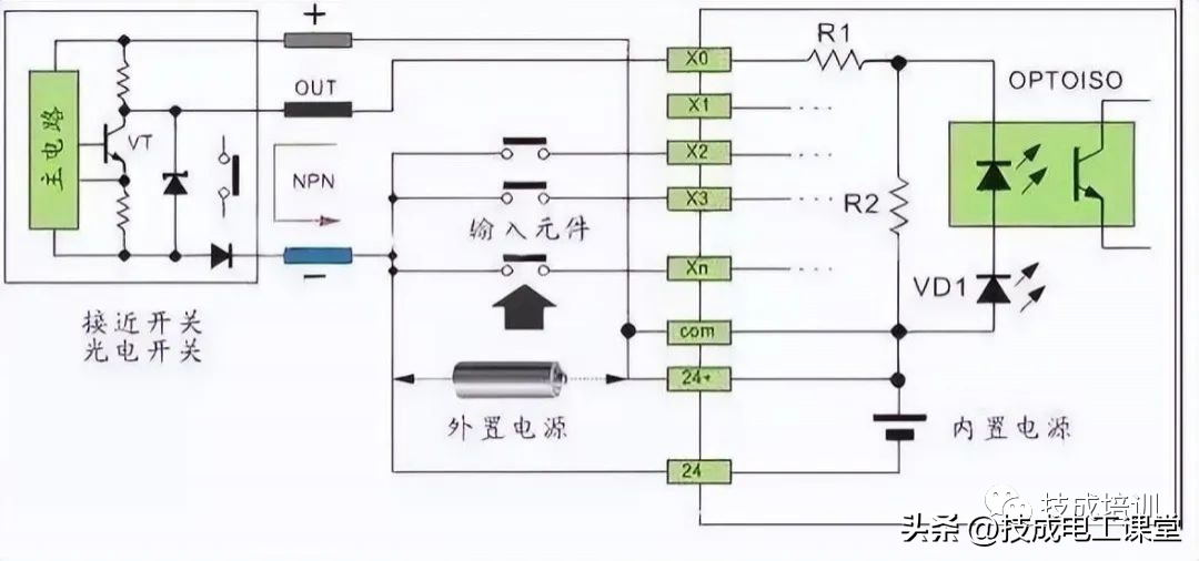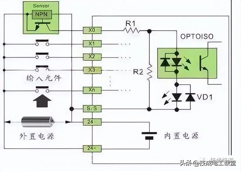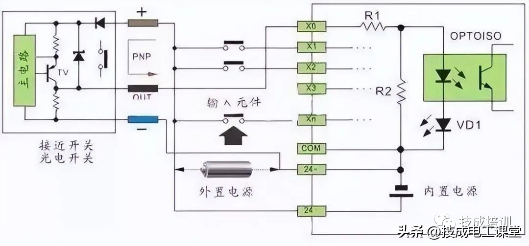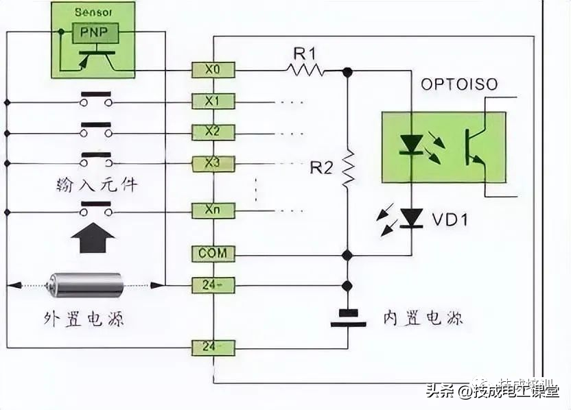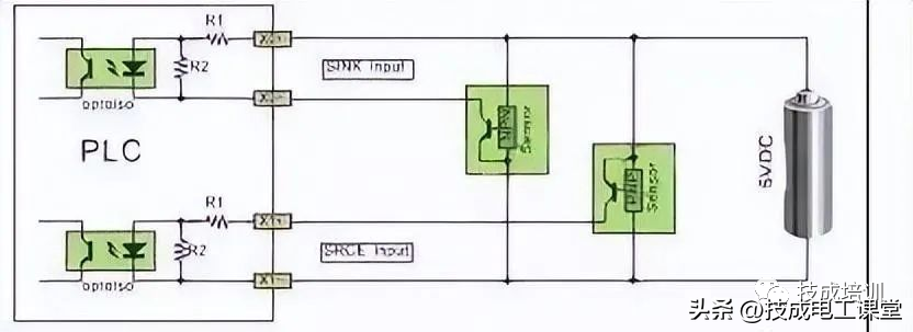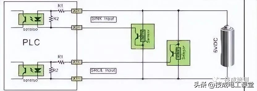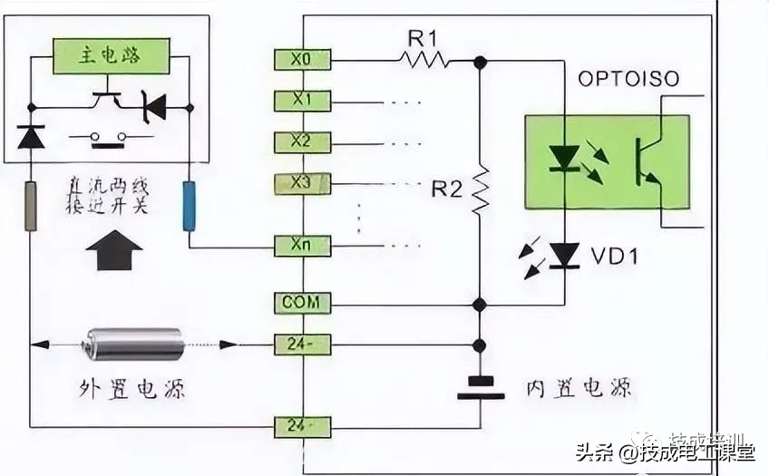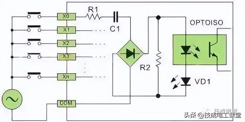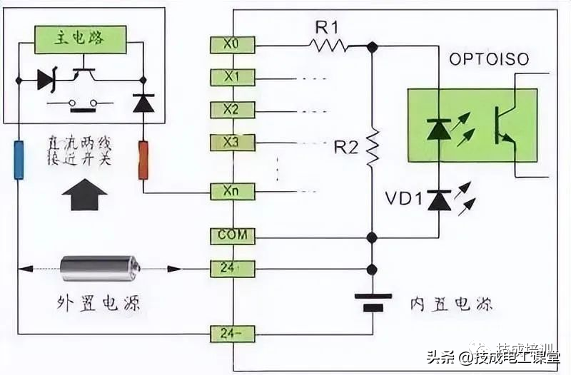直流电可以由PLC内部提供也可以外接直流电源提供给外部输入信号的元件。R2在电路中的作用是旁路光电耦合器内部LED的电流,保证光电耦合器LED不被两线制接近开关的静态泄漏电流导通。