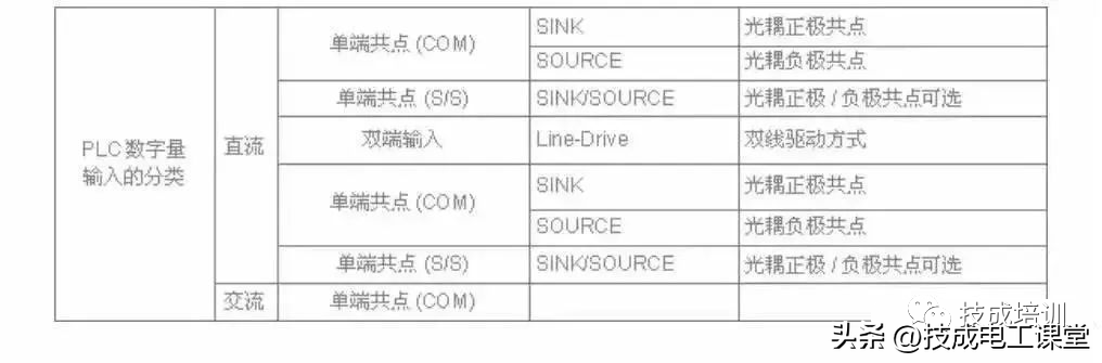 PLC的数字量输入端子,按电源分直流与交流,按输入接口分类由单端共点输入与双端输入,单端共点接电源正极为SINK(sinkCurrent拉电流),单端共点接电源负极为SRCE(sourceCurrent灌电流)。