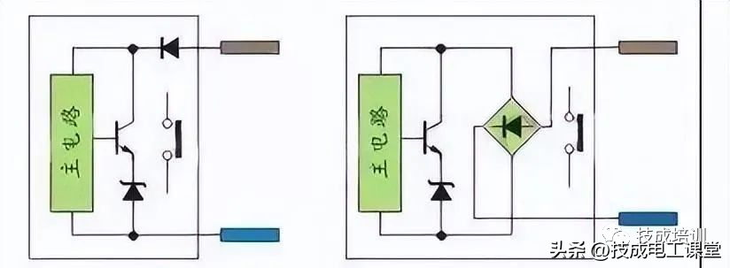 直流两线制接近开关分二极管极性保护与桥整流极性保护,前者在接PLC时需要注意极性,后者就不需要注意极性。有源舌簧磁性开关主要用在汽缸上做位置检测,由于需要信号指示,内部有双向二极管回路,因此也不需要注意极性;交流两线制接近开关就不需要注意极性。如图10: