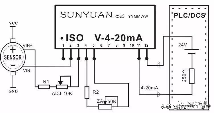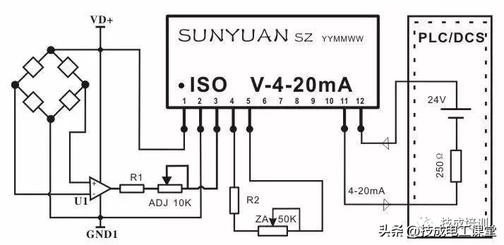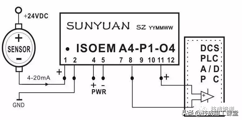 ▲图11四线制传感器信号V/V隔离后与PLC连接典型应用图