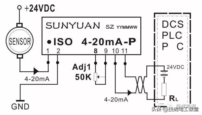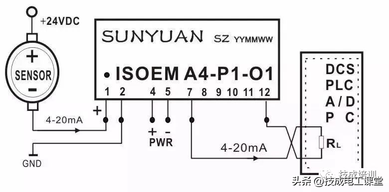 ▲图8四线制传感器信号I/I隔离放大后与PLC连接典型应用图