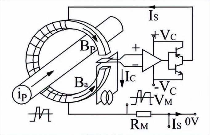 闭环电流传感器:在磁芯上饶副边线圈,在原边有电流流过时,副边线路电流产生的补偿磁通与原边电流Ip产生的磁通大小相等,方向相反,使得磁芯中磁通总量为零。霍尔器件和辅助电路产生的副边补偿电流准确反映了原边电流的大小,原副边电流大小为线圈匝比关系。