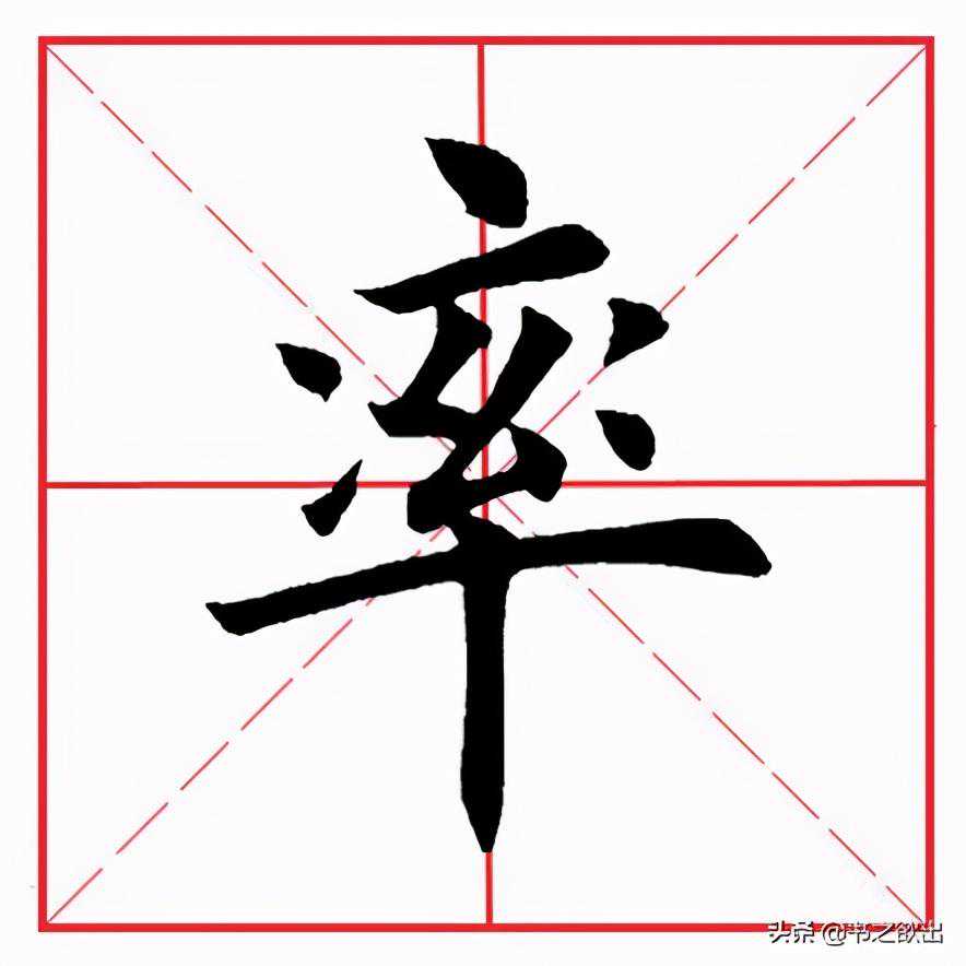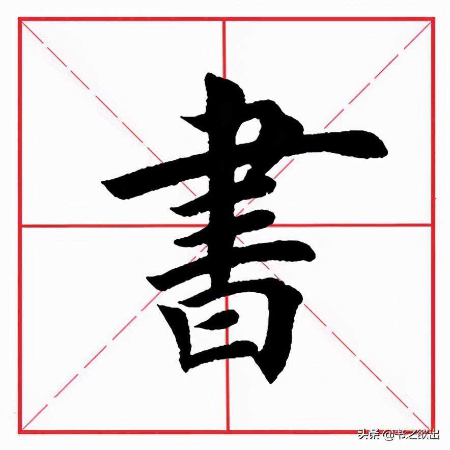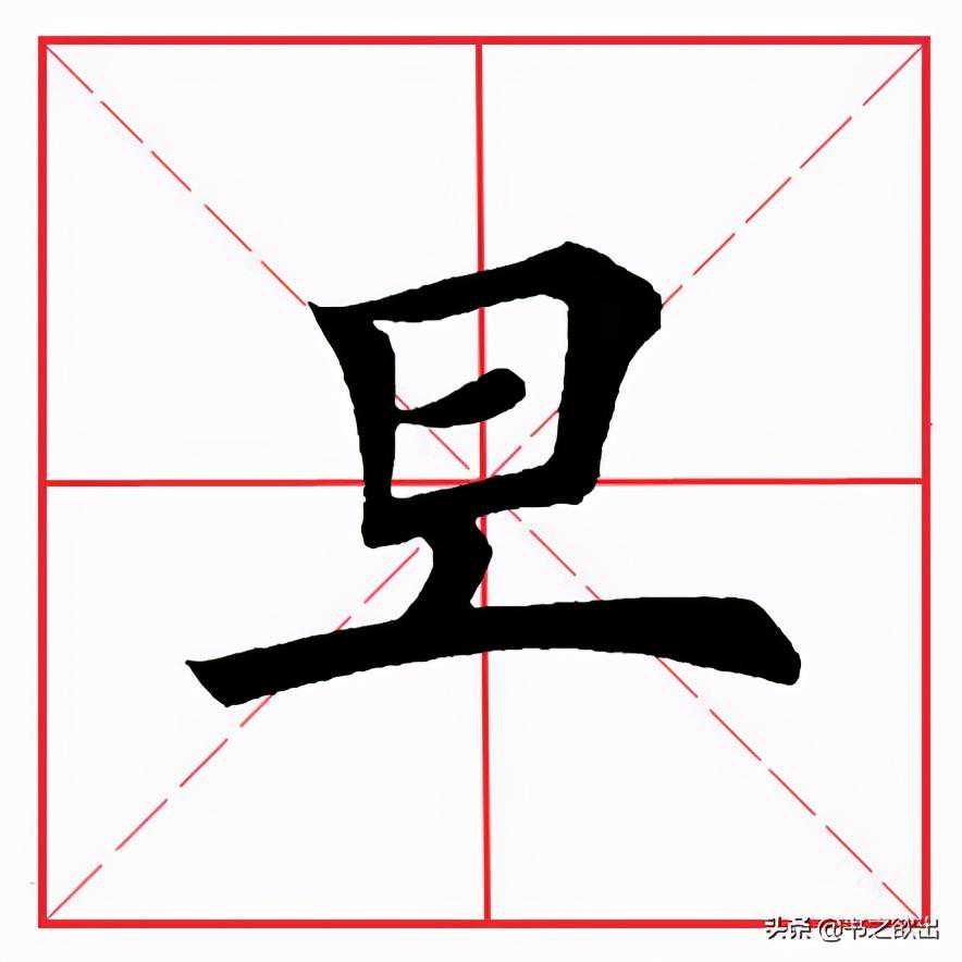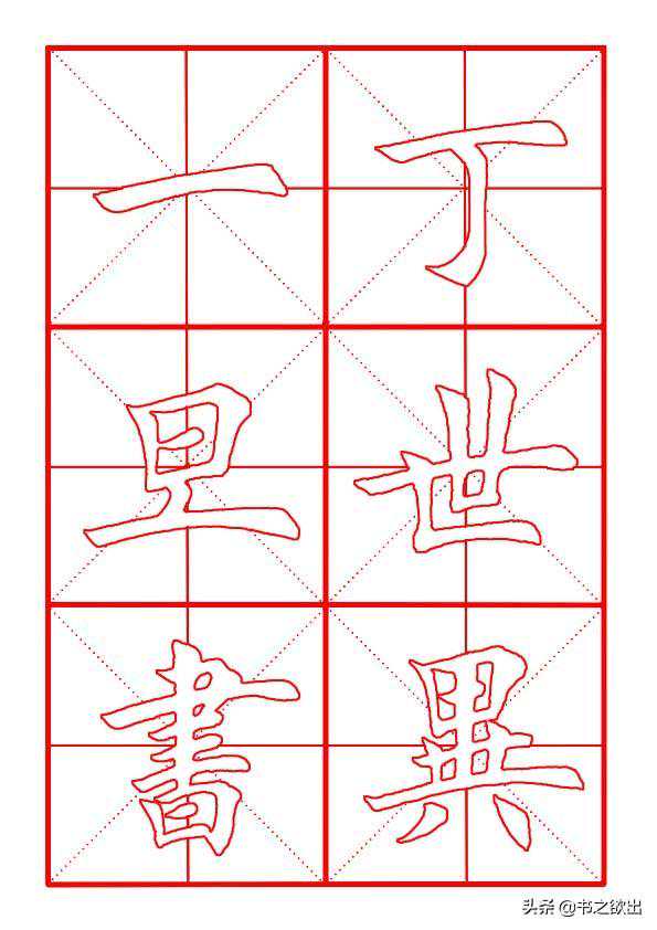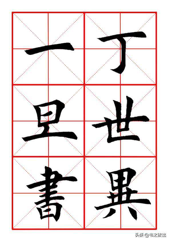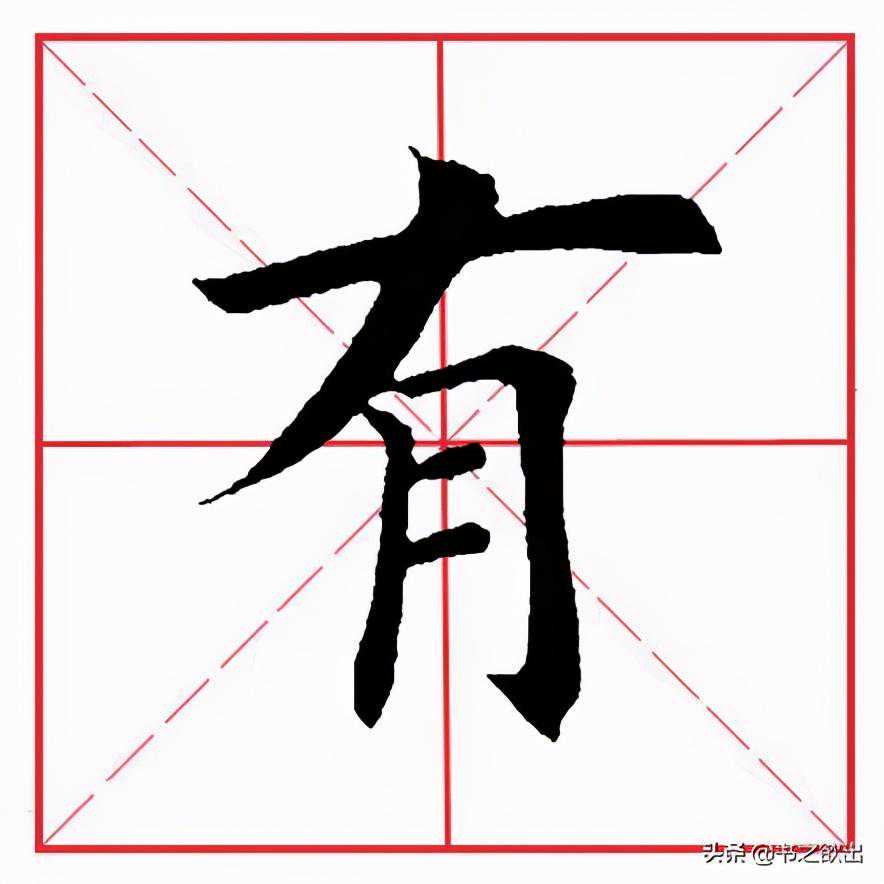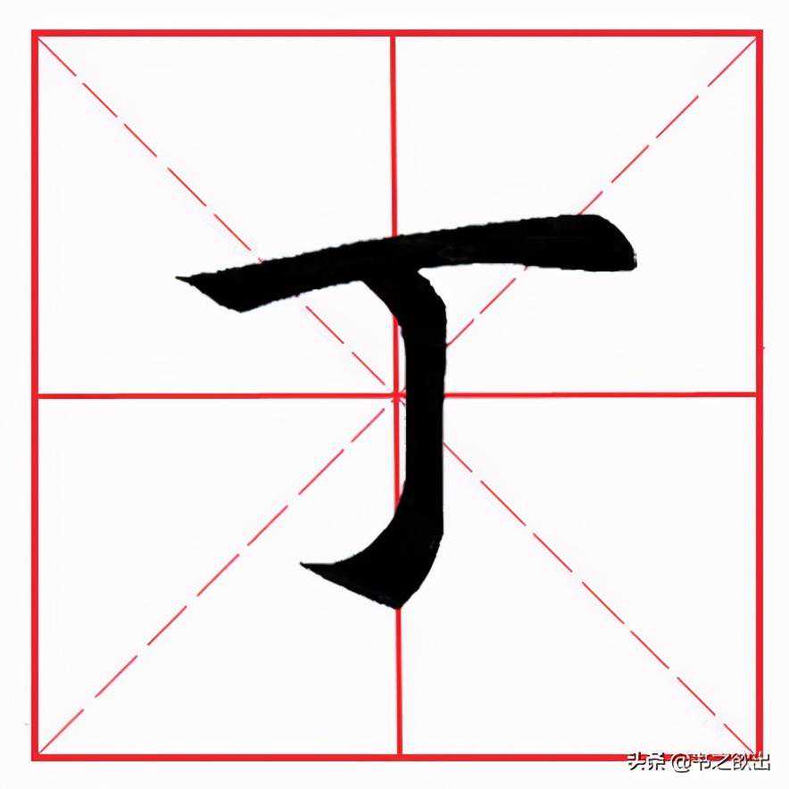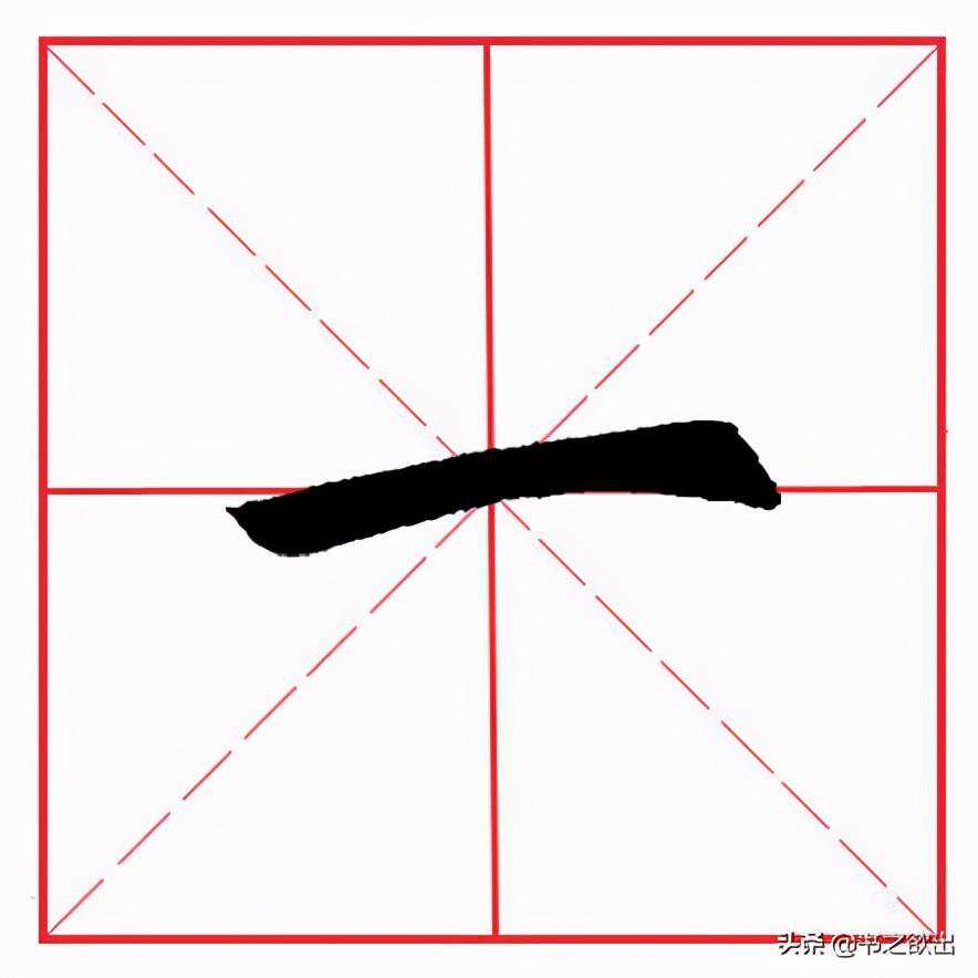起笔露锋斜切(注意露锋不可过于尖锐),然后稍抗肩向右行,中间略轻,稍带弧度,到位后轻提笔锋随即向右下方顿笔再稍向左回锋收笔,注意顿笔不要重,不可出现疙瘩。整体遒劲有力,横画上沿基本处平势,下沿略呈拱形,并且起笔上沿与收笔下沿处于同一平行线上。