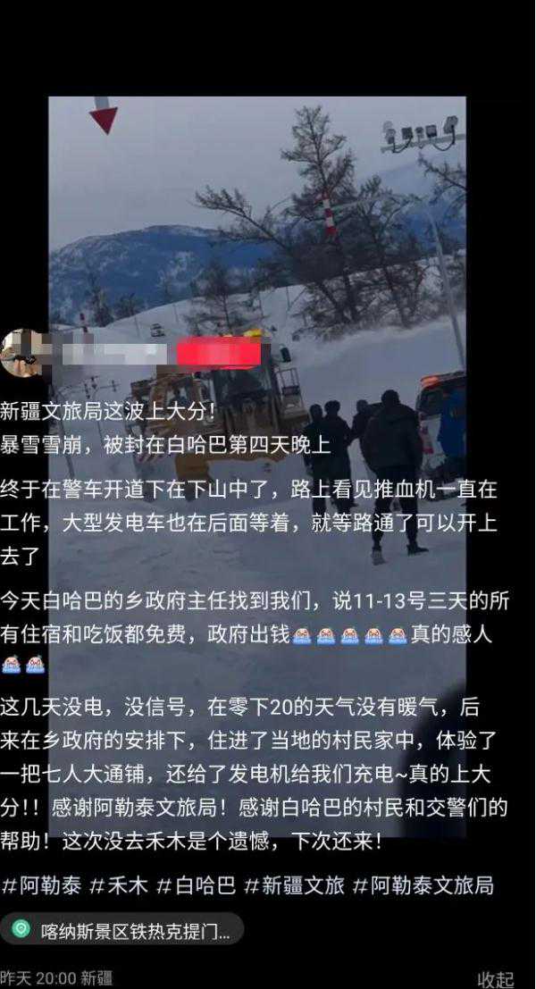 据媒体报道,连日来,新疆阿勒泰地区布尔津县山区持续降雪,因降雪量大、持续时间长,布尔津县城通往喀纳斯、禾木景区的道路多处发生雪崩阻断通行,导致旅客滞留。