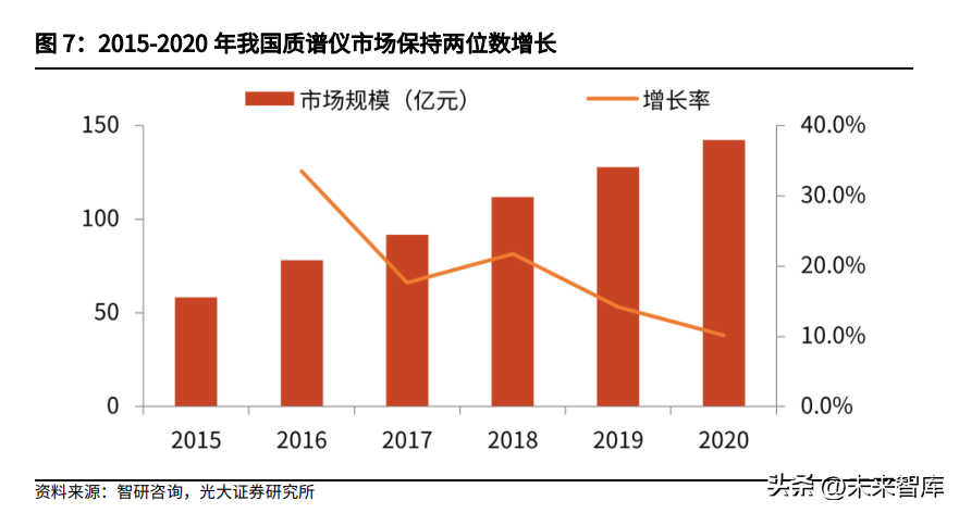 根据智研咨询统计,2020年中国质谱仪市场规模为142.2亿元,2015年至2020年中国质谱仪市场年均复合增长达19.44%。预计未来十年中国质谱仪市场规模仍将不断扩大。