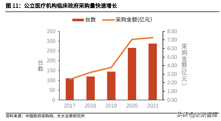 我们统计了中国政府采购网2017年以来医院、疾控中心、妇幼保健机构等公立医疗机构临床质谱仪的采购情况。样本数据统计结果显示,2017~2021年公立医疗机构的临床质谱仪采购量呈现快速增长趋势,从2017年的110台增长至2021年的288台,采购金额由2.40亿元增长至7.27亿元。