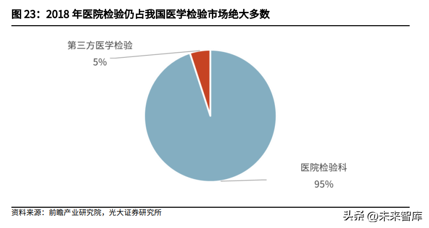 医院检验仍占主流,质谱检测有待进一步渗透目前,国内临床检验市场目前仍以医院检验科为主,根据前瞻产业研究院的数据,2018年我国的第三方医学检验仅占临床检验市场的5%左右。