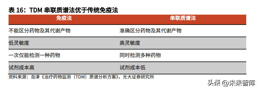 根据国际治疗药物监测及临床毒理学协会调研结果,发达国家实验室用LCMS/MS测定四种常见免疫抑制剂(环孢霉素、他克莫司、西罗莫司和依维莫司)的比例高达47%-75%。LC-MS/MS法具有更好的线性、稳定性、精密度、准确性。质谱法作为精度最高的血药浓度检测方法,在国外已经取得广泛应用,考虑到我国目前药物监测普及度较低,有比较广阔的市场前景。