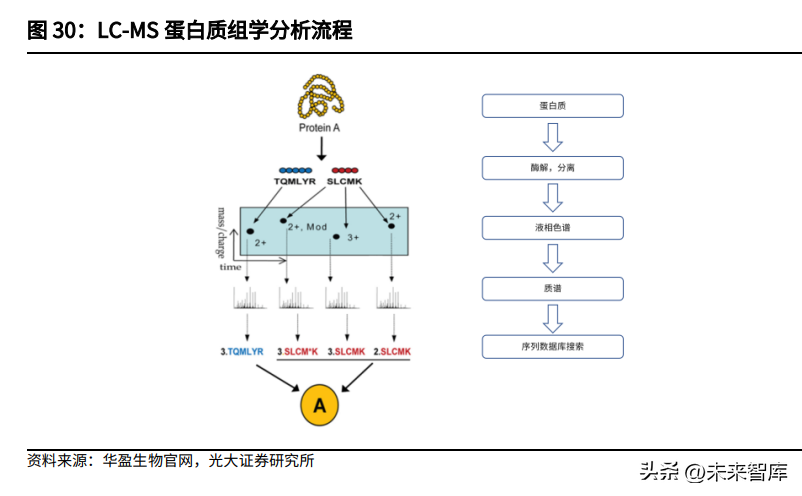 在蛋白质组学研究流程中,蛋白质鉴定是最关键的部分,而生物质谱技术在蛋白质鉴定当中一枝独秀。包括ESI-MS,MALDI-MS,串联质谱,Orbitrap等质谱技术在蛋白质鉴定当中发挥着不可替代的作用,质谱可以检测蛋白质的氨基酸组成、分子量、多肽或二硫键的数目和位置及蛋白质的空间构象等。其准确、灵敏和高通量的特点已经成为检测蛋白及多肽分子的重要技术。蛋白质组学定量是整个蛋白质组学的精华部分。在蛋白质组学的定量当中,相比传统的双向凝胶电泳及染色法,质谱具有适用范围广、灵敏度高等优点,发挥着重要的作用。在近年来新兴的靶向定量蛋白质组学中,主要包含的两类技术:多反应监测(MRM)和平行反应监测(PRM)都依赖于质谱技术。MRM主要依赖三重四级杆质谱,而更加新的PRM技术则依赖于新一代高分辨Orbitrap质谱仪。
