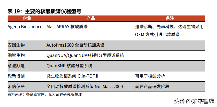 在临床上,目前MALDI-TOFMS技术已较为广泛的应用于个体识别和亲权鉴定、胎儿RHD基因型鉴定、软骨发育不全基因筛查、耳聋基因热点突变检测等方面。目前已经有多家企业推出核酸质谱,主要有AgenaBioscience推出的MassARRAY核酸质谱,以及国内安图生物的Autofms1600、融智生物的QuanNUA/QuanNUA+核酸分型质谱系统、意迪默诚的QuanSNP核酸分型系统等。
