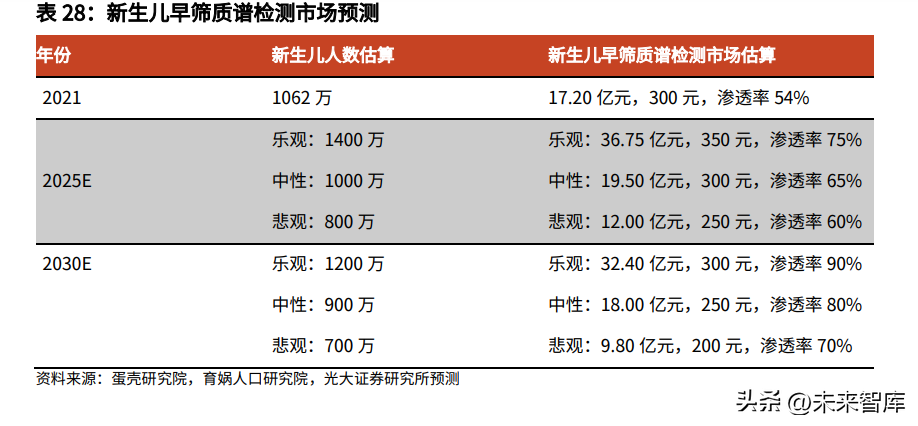 根据蛋壳研究院测算,2021年我国新生儿数量为1062万人,新生儿早筛质谱检测市场规模17.2亿元,新生儿质谱渗透率为54%。此外,根据育娲人口研究院的预测,2025年新生儿人数约为1000万左右,2030年约为900万左右。