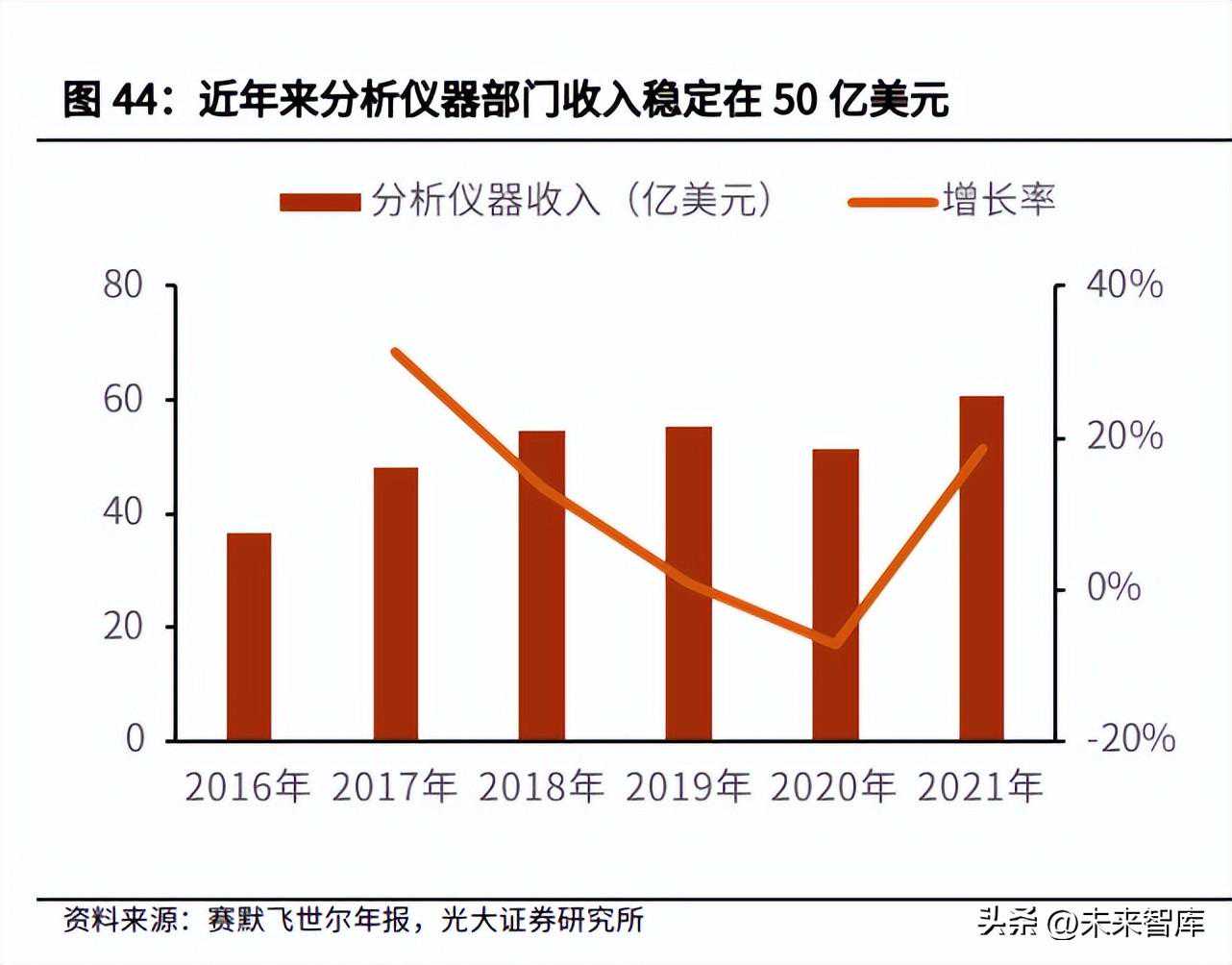 根据公司2021年报,2021年赛默飞世尔科技营收392.1亿美元,较2020年增长21.7%;净利润为77.3亿美元,较2020年增长21.2%。在营收、利润和自由现金流方面均取得增长。赛默飞世尔科技利润长期维持在较高水平。毛利率长期处于40%以上并保持上升态势,净利率整体呈上升趋势,由2016年的11%增长为2021年的20%。分析仪器板块收入与利润在维持较高水平。分析仪器板块业务主要包括实验室场景的仪器、消耗品、软件服务等,近年来收入稳定在50亿美元以上,受新冠疫情影响,2021年分析仪器板块收入为60.69亿美元,同比增长18.44%,占总营业收入15.5%。