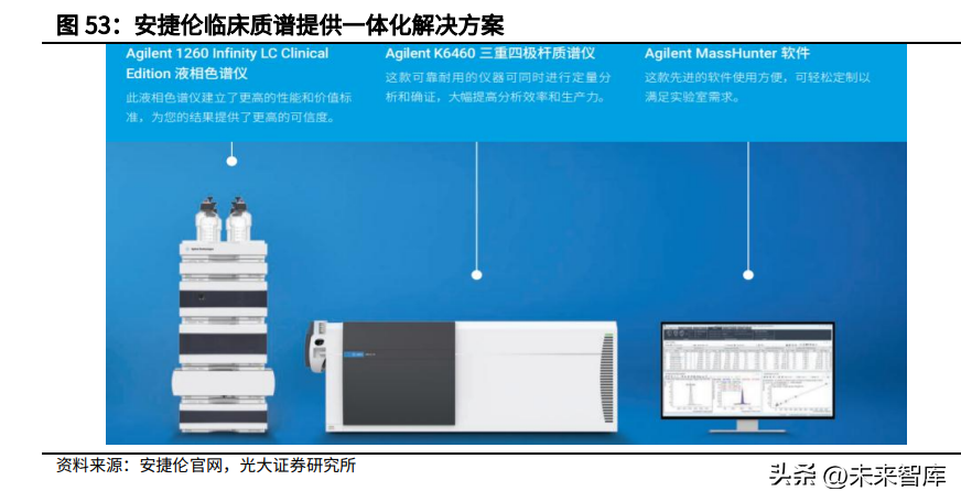 在临床质谱领域,公司推出了AgilentClinicalEditionLC/MS产品系列。目前在国内市场有安捷伦InfinityLCClinicalEdition/K6460液相色谱串联质谱系统获得药监局注册批准。该产品包括液相色谱仪、三重四极杆质谱仪以及MassHunter软件,提供了一套完整的解决方案,具有出色的灵敏度、可靠性以及优异的整体系统稳定性。