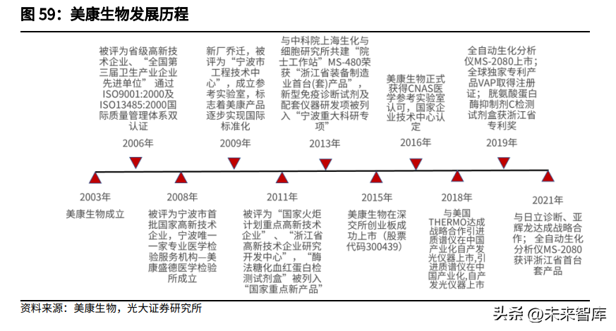 美康生物创立于2003年,是一家专业从事医学诊断产品研发、生产、销售及服务的国家高新技术企业。主要产业为体外诊断试剂、仪器及独立第三方医学诊断服务。截止2022年8月,已取得402项体外诊断试剂产品注册证、53项诊断仪器产品注册证书,产品线涵盖生化、发光、血球、尿液、质谱、分子诊断、血脂亚组分检测VAP和POCT等,是我国IVD行业内少数能够同时提供诊断试剂和诊断仪器的供应商之一。