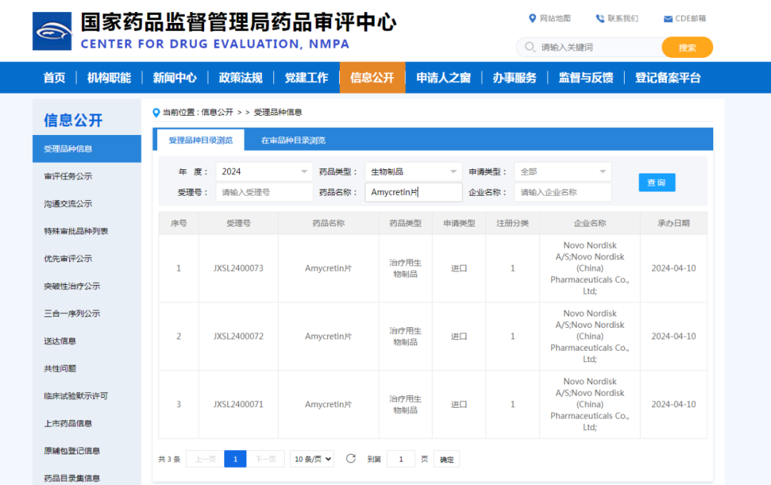 4月10日,中国国家药监局药品审评中心(CDE)官网公示,诺和诺德1类新药amycretin片的临床试验申请获得受理。