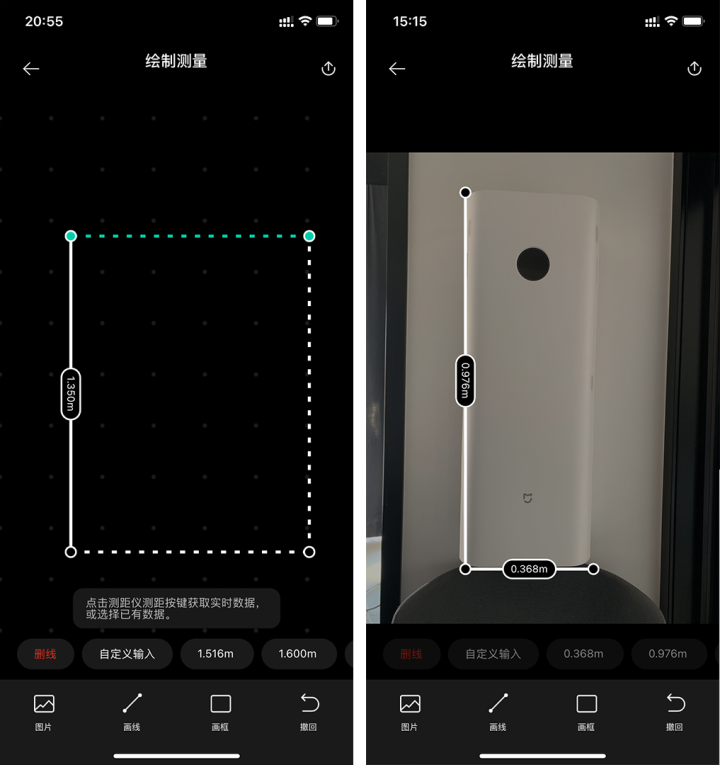 并且该APP还拥有绘制测量的功能,在绘制复兴的时候就不用传统的笔和纸画了,直接在APP里面就可以实时记录,还是挺方便的。并且相较于传统的测量方式,通过这款智能测距仪还可以直接进行图片记录尺寸,比如我这边挂了一个米家的新风机,假如还没安装的话就可以先使用测距仪拍下实景图,然后测量好距离和尺寸,然后再买就不会出现尺寸不匹配的情况,特别是买电视很多时候到手了才发现买小了,所以装修钱就确定安装的尺寸还是非常有必要的。