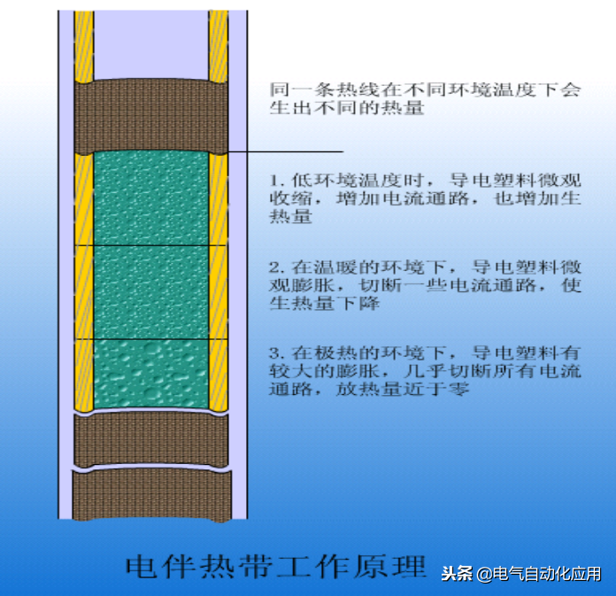 使用的电伴热带一般为自限式电伴热带。这种电伴热带可以使电伴热管线上的每一点随着周围温度的变化而改变发热量。温度升高时,电伴热带可以自动降低发热量。温度降低时,电伴热带可以自动提高发热量。这种自控性可以随时补偿温度的变化,避免电伴热带过热或发热不足。
