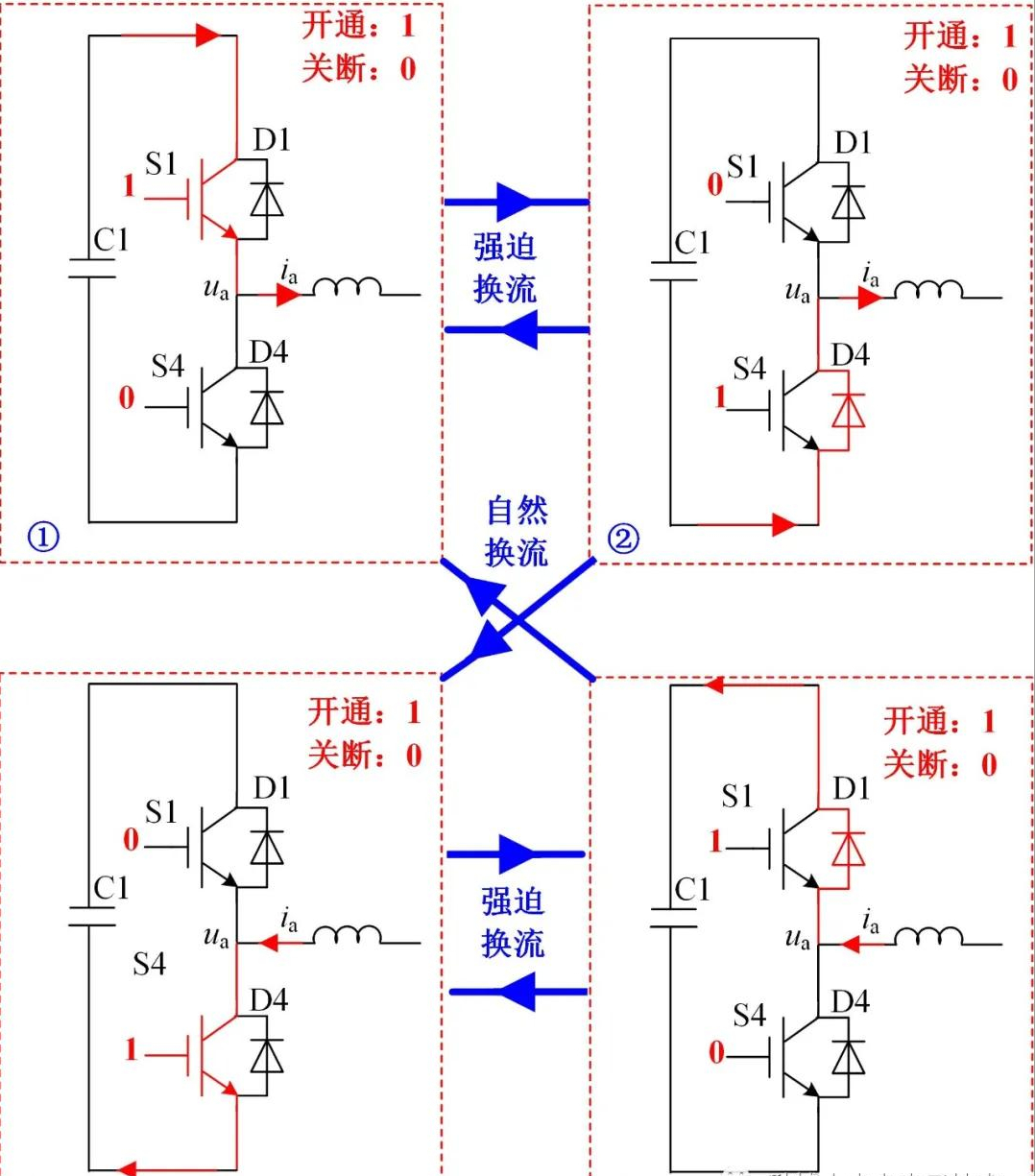 当电路稳定工作在状态①时,如果关断S1,由于负载电感存在,负载电流ia不能突变,这时候D4会起到接力作用,经过短暂的死区时间后,S4打开,但是对负载电流ia并没有影响,电路ia方向没有变化,但是会逐渐减少。