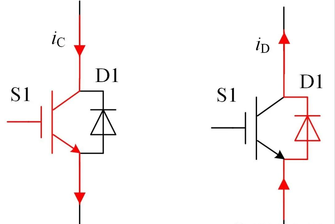 为了研究IGBT的换流过程,我们引入“自然换流”和“强迫换流”两个概念。主要是因为并不是所有的IGBT开关过程都会引起换流,也要看具体的电路情况。根本原因是IGBT内部集成了续流二极管,在实际工作时,有可能是IGBT承载电流,也有可能是内部二极管承载电流,如下图所示。