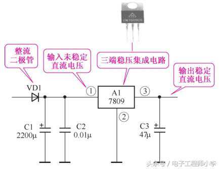 电路中的C1为滤波电容,其容量比较大;C2为高频滤波电容,用来克服C1的感抗特性;C3是三端稳压集成电路输出端滤波电容,一般容量较小。