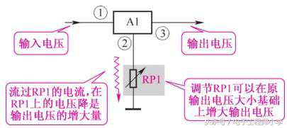 当RP1的阻值调到为0Ω时,就是典型的三端稳压电路;当RP1阻值增大时,这一电路的输出电压增大。