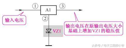 VZ1是稳压二极管,集成电路A1②脚输出的电压使VZ1导通,这样②脚对地之间的电压就是VZ1的稳压值,所以这一稳压电路的输出电压大小就是在A1输出电压值基础上加VZ1的稳压值。