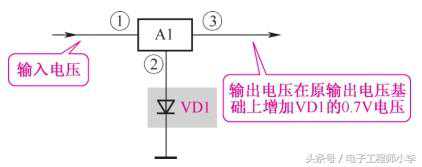 电路中的VD1是二极管,正极接A1的②脚,VD1在②脚输出电压作用下导通,VD1上的压降为0.7V,所以这一稳压电路输出的电压比典型电路高0.7V。如果多串联几只二极管,输出电压还会增大。