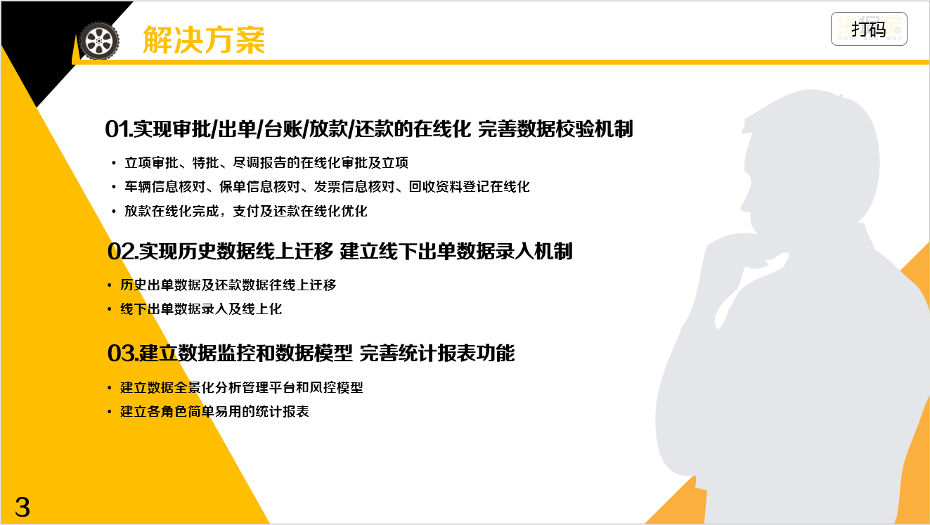 针对关键问题的解决方案,也是产品说明书的重点内容。如何运用各种技术和工具,出具完善的解决方案,并开发新的产品或新的功能模块来解决问题体现了公司产品部门的核心能力。由于产品开发的原则是快速上线,更新迭代。先满足可用性,再迭代升级用户体验。所以解决方案一般要分阶段进行,每个阶段都有每个阶段的产品目标并具有业务可用性。