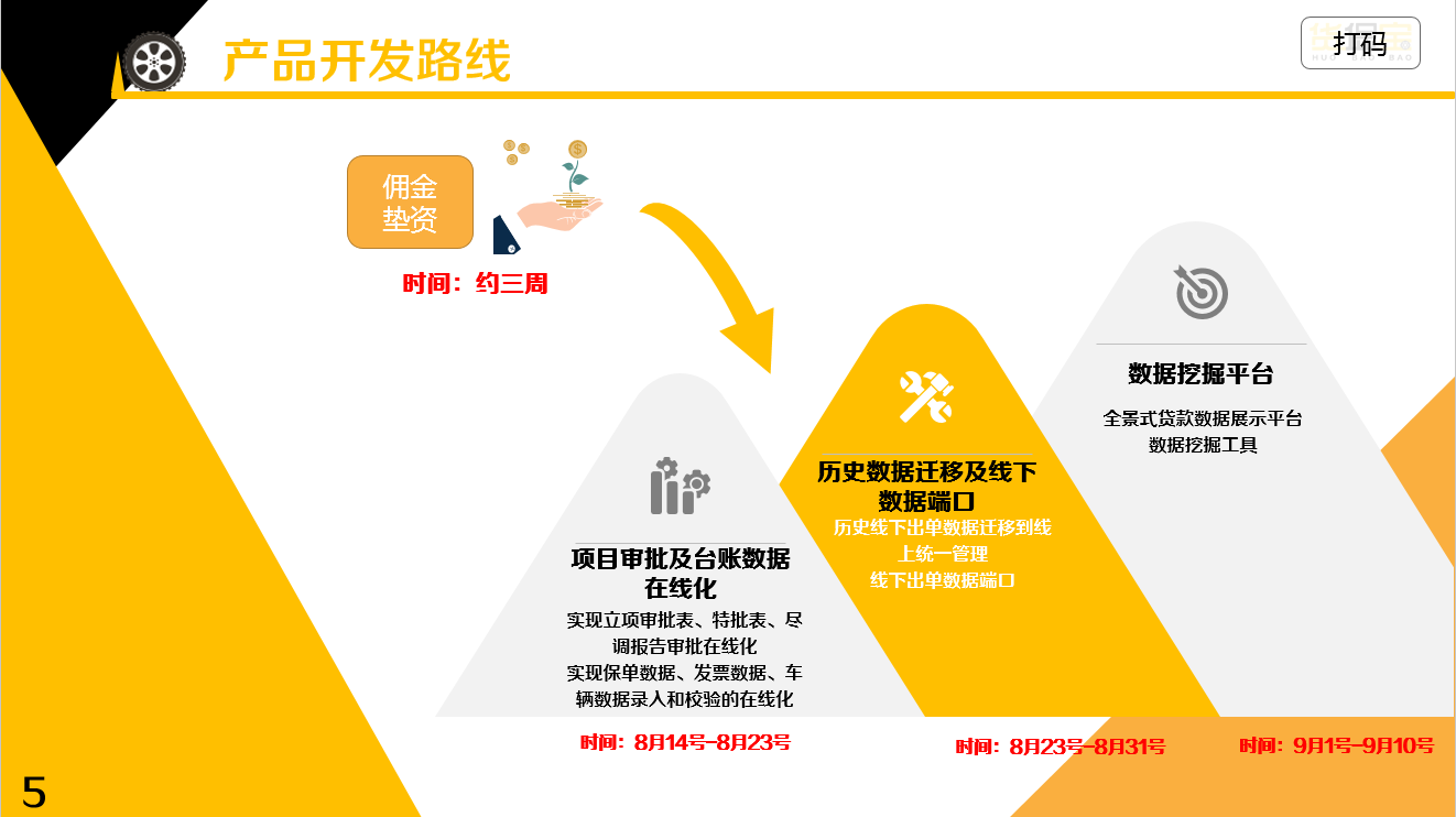 实际案例中给出了解决方案中三个阶段产品开发所需要的时间表。由于企业近期有开展佣金垫资业务的需求,所有佣金垫资也急需开发,在评审会上就几个产品开发做了说明和探讨。