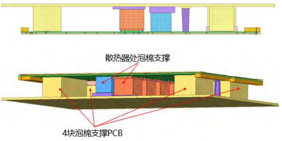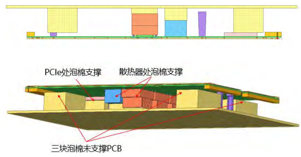 方案一:散热器未支撑,PCB表面仅1块泡棉支撑PCIe处,3块泡棉距离PCB10mm,泡棉与PCB表面预留缓冲距离。