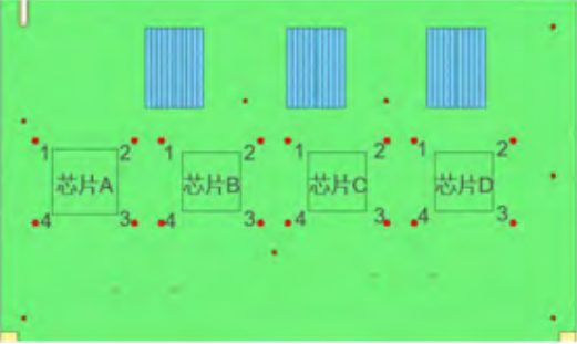 以PCB板表面4个芯片四角应变为对比变量(如图10),分析各方案优劣,评估不同支撑方案优化效果。参照可靠性规范(GB/),跌落过程PCB表面应变Spec为1200,并且红墨水实验后确保芯片焊点无锡裂。