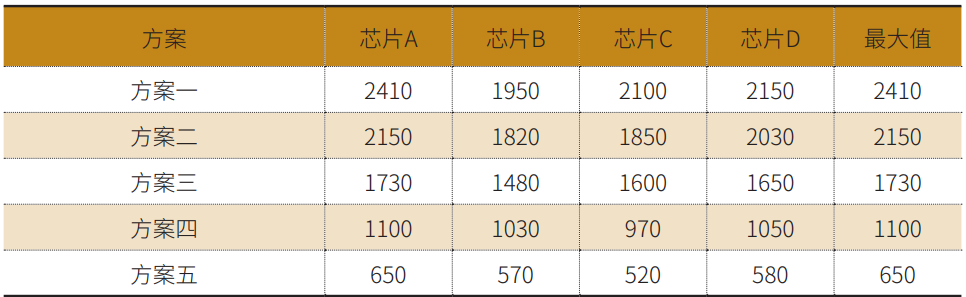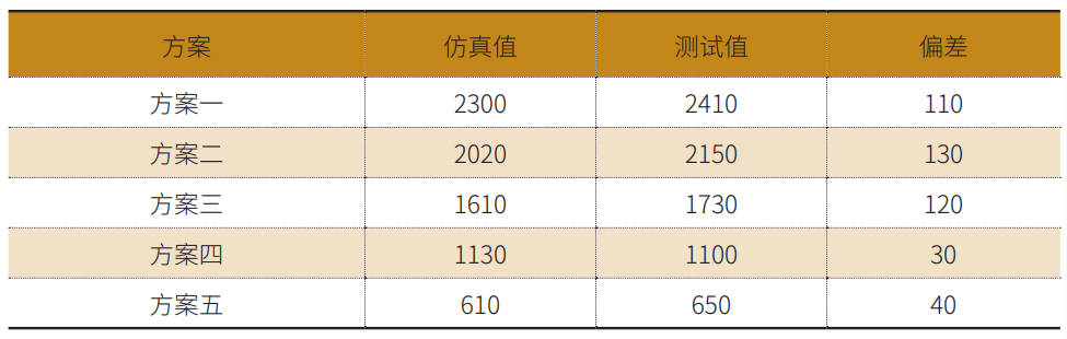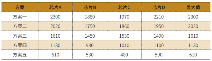 五个方案跌落仿真过程PCB芯片四角应变最大值数据,如表2。(由于应变数据较多,本文只对比芯片四角应变最大值。)