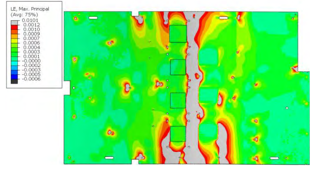方案一PCB散热器未支撑,PCB表面仅一块泡棉支撑PCIe处,其余三块泡棉距离PCB10mm,泡棉与PCB表面预留缓冲距离。包装跌落过程,PCB为倾斜状态,且PCB有较大的变形活动空间,故变形较大,芯片附近应变值超标。方案一变形及应变云图,如图11、图12所示。