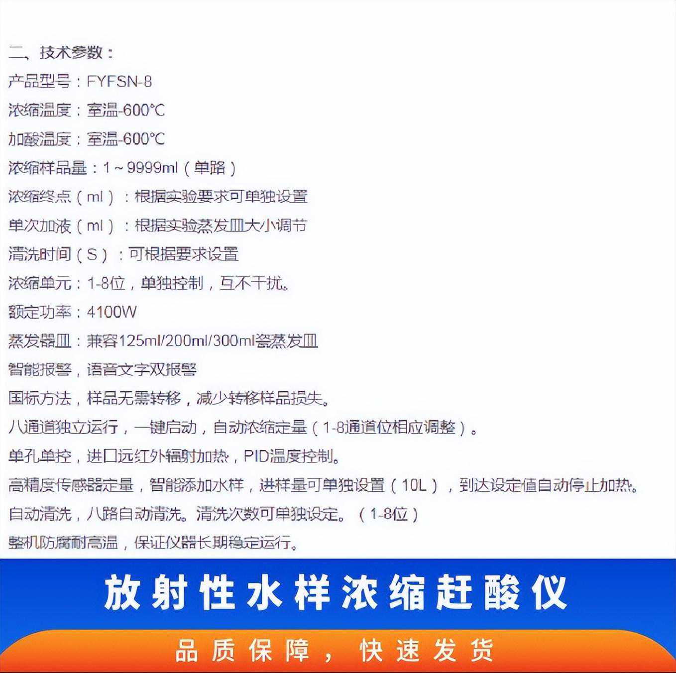 放射性水样浓缩赶酸仪采用远红外辐射加热,PID温度控制,实验过程中通过蠕动泵和高精度称重模块配合实现精准定量浓缩,可同时处理1-8位样品浓缩,实现无人值守,提高实验效率,适用于水质及自来水行业,放射性总α、β及其他放射性水样检测过程中的水样蒸发浓缩赶酸全自动前处理;环境空气降尘样品自动蒸发浓缩;溶解性总固体(TDS)项目的蒸发浓缩。