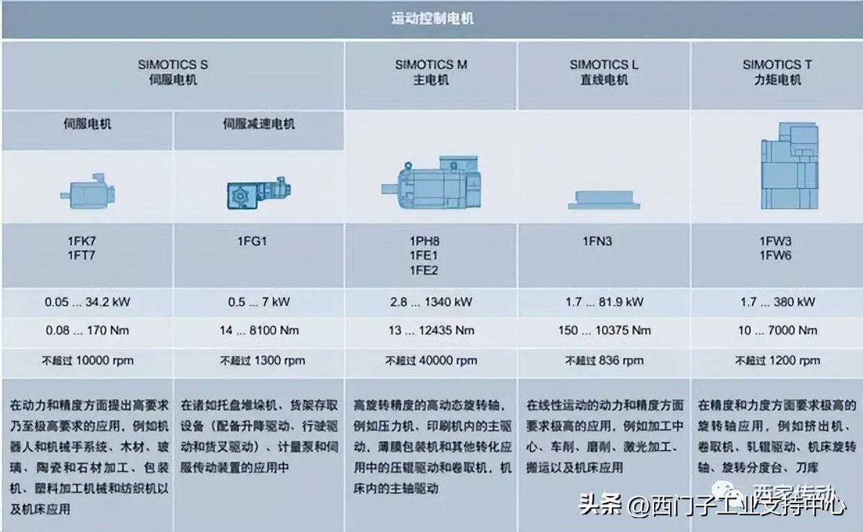 无论是伺服电机还是主电机,也无论是直线电机还是力矩电机,这些电机都非常适合使用SINAMICS并实现高效运行,整个产品线中的产品具有令人信服的紧凑性、精度和动态性能,其分类如下表: