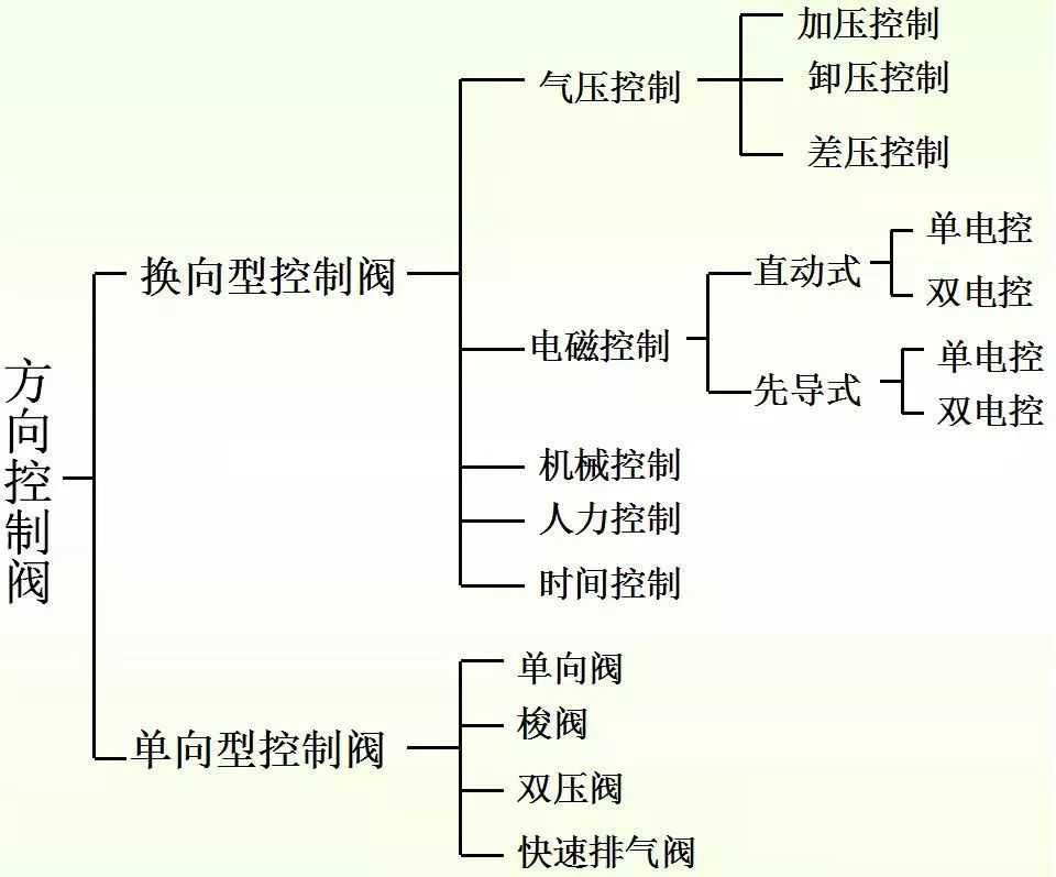 只允许气流沿一个方向流动的方向控制阀称为单向型方向控制阀,如单向阀、梭阀、双压阀等。可以改变气流流动方向的方向控制阀称为换向型方向控制阀,简称换向阀。