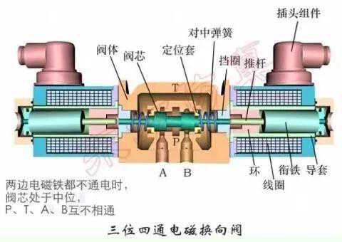 三位,是指此换向阀有三个位置,左位,中位,和右位。五通,表示一共有五个接口,也就是此电磁阀上面有五个油口与系统管路连接。其工作原理如下: