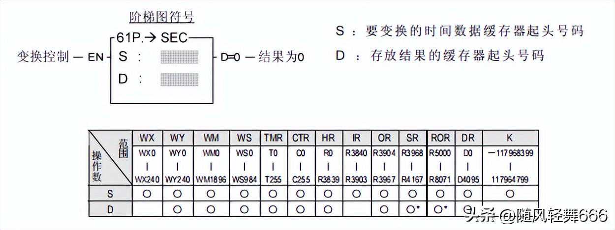 本PLC指令是和(时:分:秒)时间相关的指令,其时间数据将自动合并连续3个缓存器(Word)来当时间值使用,其起头第一个为秒数(Second)缓存器,下一个为分数(Minute)缓存器,最后一个则为时数(Hour)缓存器。每个缓存器的16个位中只有B14~B0用以表示时间值,而其最高位B15则用以表示各该时间值的正、负。B15为0表示该时间为正,B15若为1则表示该时间值为负,B14~B0的时间值是以二进制表示,当时间值为负时,B14~B0则以2的补码表示。运算的秒数结果为(时:分:秒)三个缓存器的秒数加减结果。