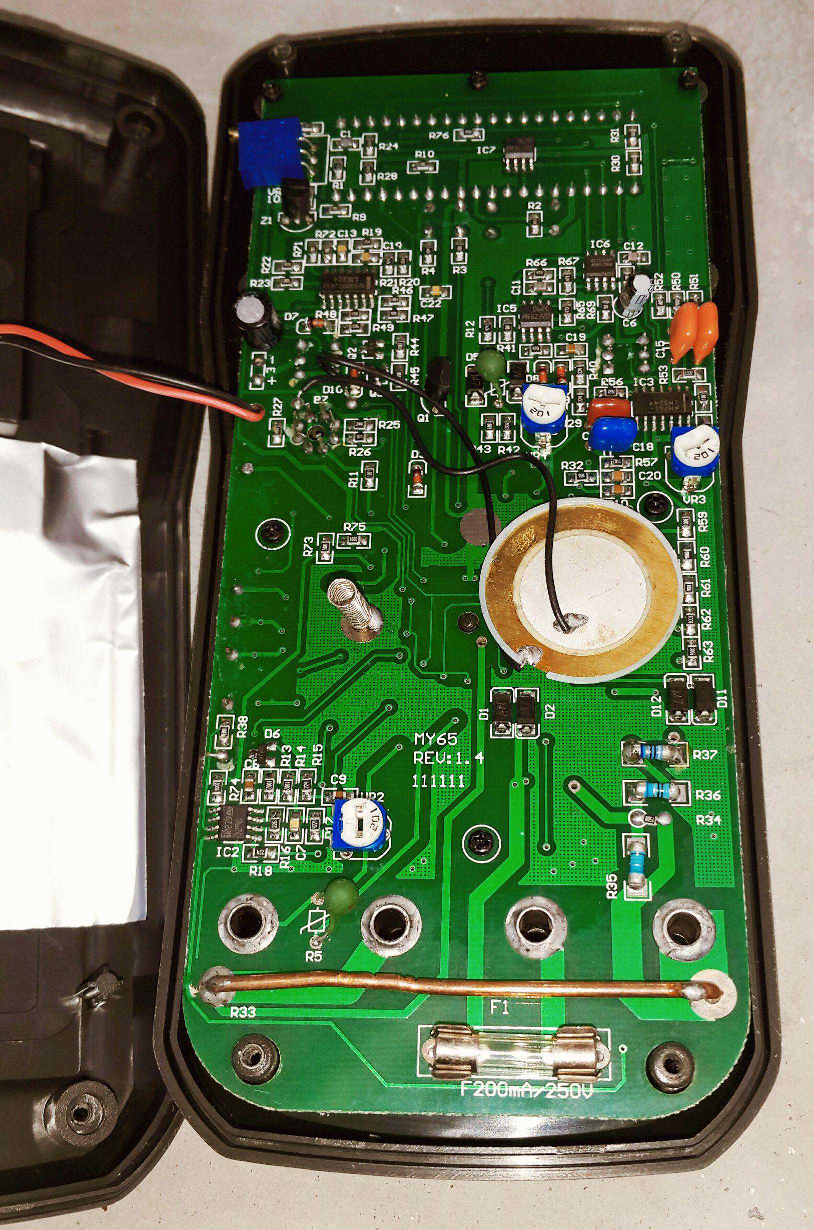 拆开后盖的样子,可以看到主电路板了;后盖上贴有一层金属铝皮,用来防止外界电磁场对仪表造成干扰。