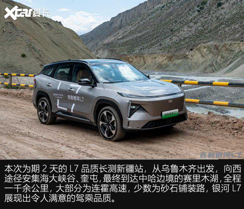 5月31日晚,吉利银河L7正式上市,新车共推出5款配置车型,共分纯电续航55km和115km两个版本,售价区间13.87-17.37万元,搭载1.5T发动机+3挡DHT变速箱组成的插电混动系统,CLTC工况综合续航里程达到1370km。根据乘联会最新公布的6月销量情况,吉利银河L7上市首月销量9673台,其中顶配车型占比90.5%,可见银河L7无论是产品力还是定价策略都相当成功,这在当下低迷的国内汽车市场,可以说表现相当亮眼。在L7上市之前,吉利曾组织媒体进行了场地试驾,短暂的试驾体验和未量产的工程样车,都不能全方面表现银河L7的产品力。而上市一个多月,吉利组织了“吉利银河L7十万公里品质长测”系列活动,让媒体和用户通过长时间的试驾,更深入体验银河L7的高品质和产品优势,而第一站就选在了新疆。