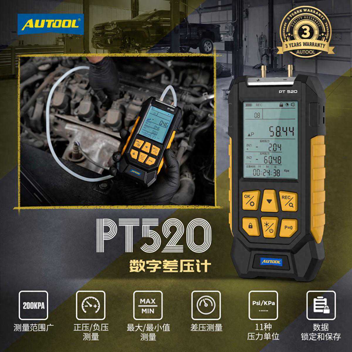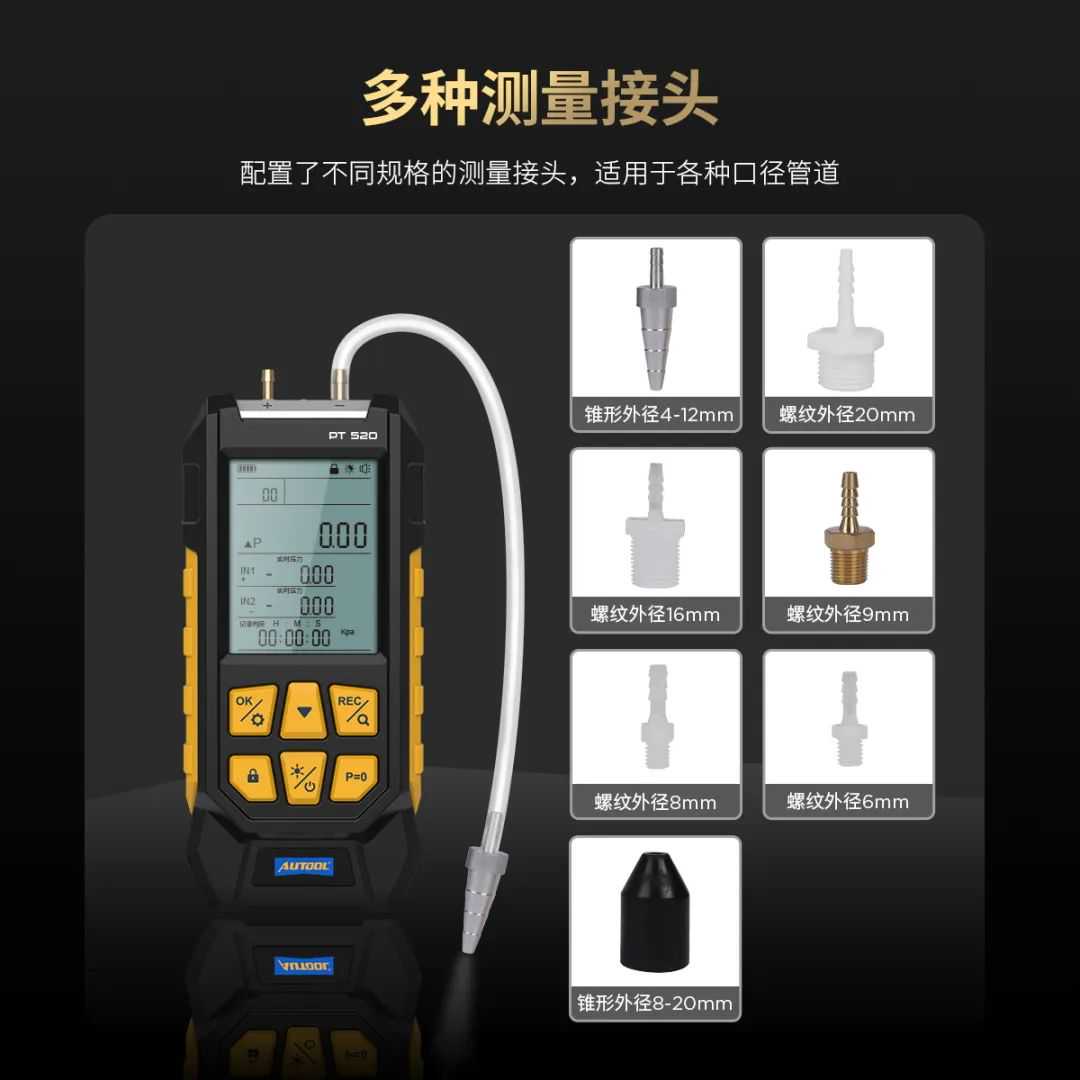 PT520是AUTOOL数字差压计系列中的基础款式,其性能和精度足以满足常见的差压测量要求。在汽车检测与维修领域,如果需要测量的差压范围较小并且主要应用于测量气流相关系统,那么选择PT520将会更加经济实惠且满足工作需求。