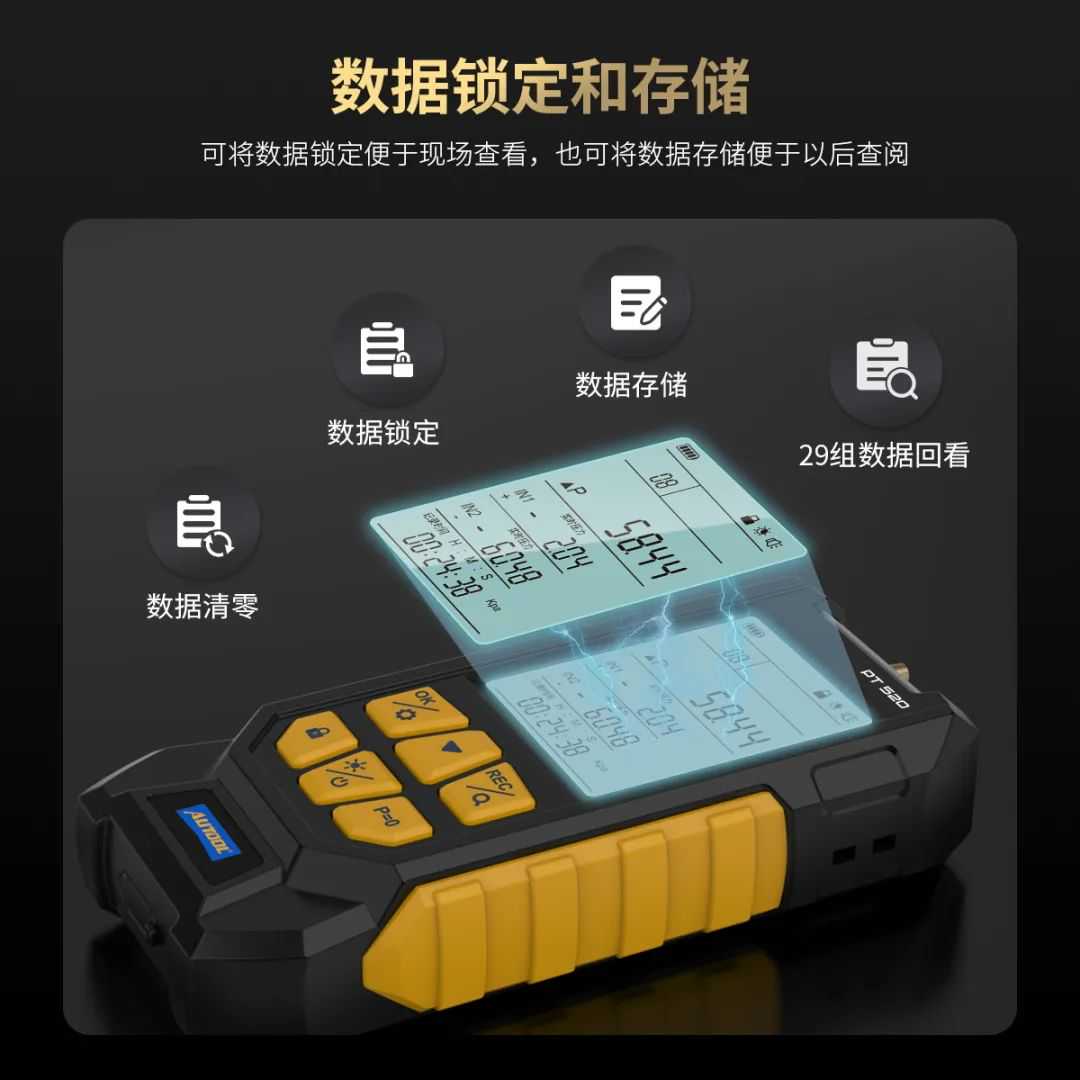 AUTOOLPT520数字差压计具备高精度压力传感器和多种实用功能,能够提供准确可靠的压力差值测量结果,并且相较于市面上只具有显示压力差值功能的常见差压计,PT520升级增加了数据记录及数据查看两种功能,为用户进行汽车相关系统的压力监测、故障诊断和维护等工作提供了综合性能更为全面的设备选择。
