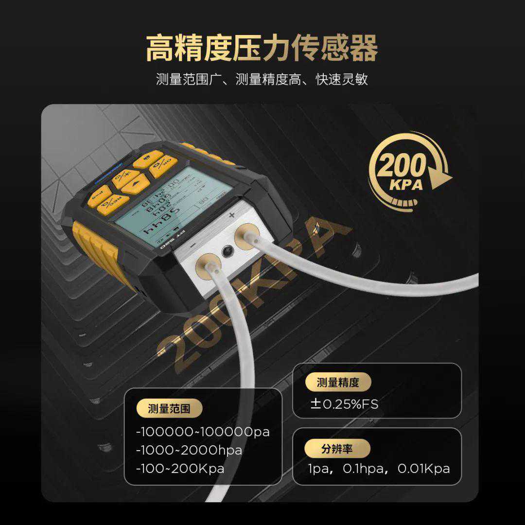 内置高精度压力传感器,能够快速灵敏地捕捉压力变化并提供实时的测量结果。支持在-100~200Kpa范围内进行差压测量,并且将测量数据的精度控制在±0.25%FS(-90~100Kpa)范围内,有效确保压差测量的可靠性和效率性。