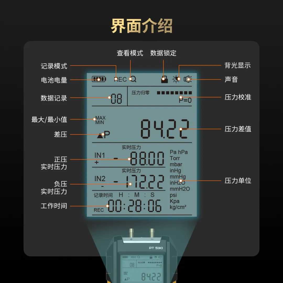 不同的测量模式使得设备能够满足不同应用场景下的需求,并提供更加专业和全面的压力测量结果,帮助用户进行系统监测、故障诊断和维护工作。