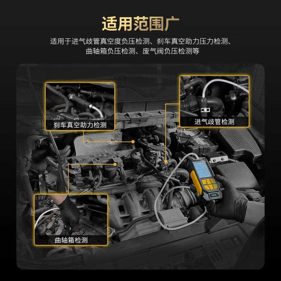 专业应用于汽车领域,适用于进气岐管真空度负压检测、刹车真空助力压力检测、曲轴箱负压检测、废气阀负压检测等多项差压测量工作,一机即可满足汽车各气流相关部件压力差值的测量需求。