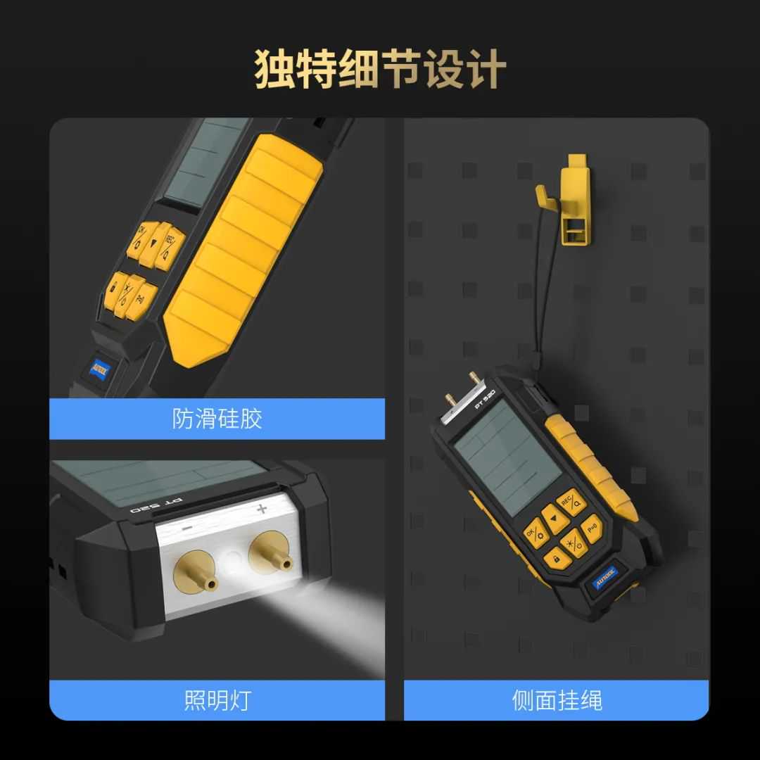 【部件设计】:采用照明灯、侧面挂绳、手持防滑硅胶等实用装置以增强设备的便携性和易用性。