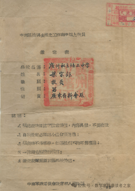 *1952年抽调梁宗巨前往东北工作的教员鉴定表