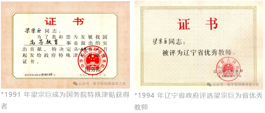 由于梁宗巨教学科研工作成绩突出,1980年由省政府提名晋升为教授。在“拨乱反正”后,梁宗巨六次被评为大连市劳动模范,1980年还被评为市特等劳模。1989年梁宗巨被评为全国归侨、侨眷优秀知识分子。1993年获首届曾宪梓教育基金会高等师范院校教师奖一等奖。因梁宗巨为国家高等教育做出的突出贡献,他于1991年获首批国务院政府特殊津贴。梁宗巨不计个人恩怨无私奉献的精神是他民族精神和家国情怀的集中体现。他有许多海外关系,其兄梁宗恒在法国定居多年,其姐梁佩华已举家移民美国,还有亲属在台湾、香港、加拿大等地生活,但他从未考虑过移居他乡。